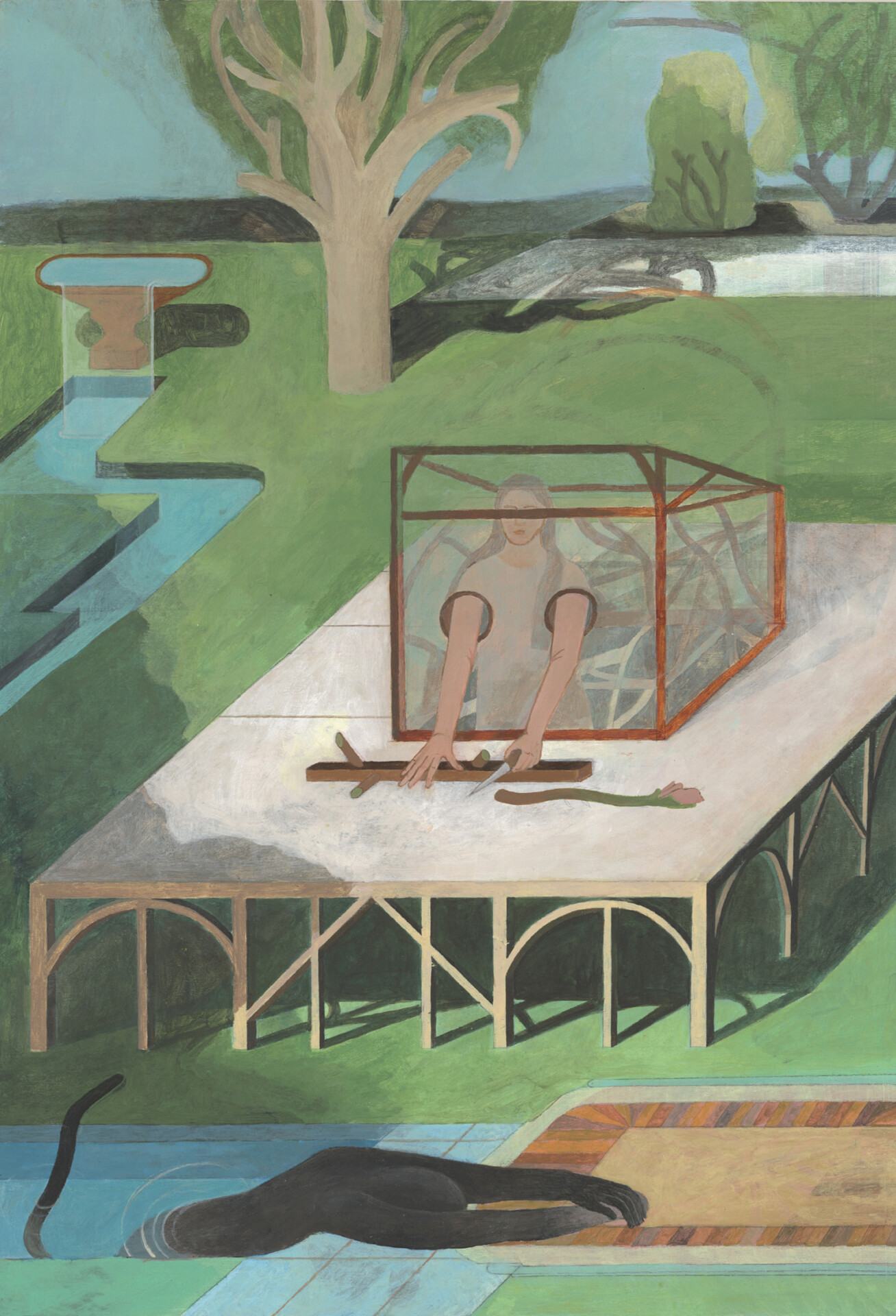 L’exposition, composée de différents médiums, se présente comme une traversée de divers espaces de vie : intérieurs suggérés, lit, tapis, éléments de mobilier, peintures et représentations de paysages. Par le biais de ces installations-décors, et en écho au conte et à la matière, Bois dormant explore la coexistence de deux temporalités : ce qui s’arrête et ce qui croît au sein de ces intérieurs.